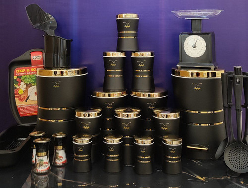 سرویس آشپزخانه ۲۹ پارچه کمر باریک مشکی درب طلایی شفق